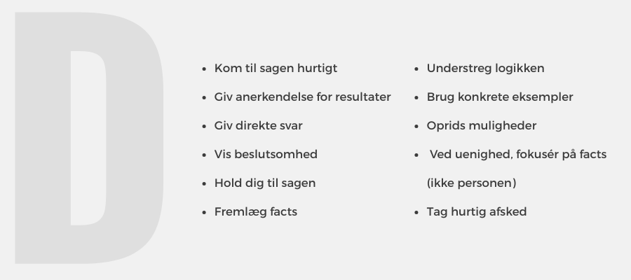 Det, der karakteriserer en D'er, er deres direkte og målrettede facon. De er, som vist ovenfor, sagsorienterede, udadvendte og opererer i et højt tempo. De er drevet af at skabe resultater hurtigt, at handle på udfordringer og at udfordre sig selv og andre.