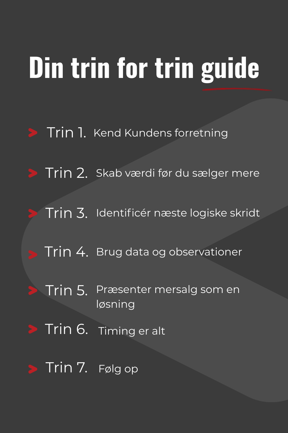 Spørg dig selv: Hvad er det naturlige næste behov for kunden? Ikke hvad du vil sælge, men hvad der reelt hjælper kunden videre.