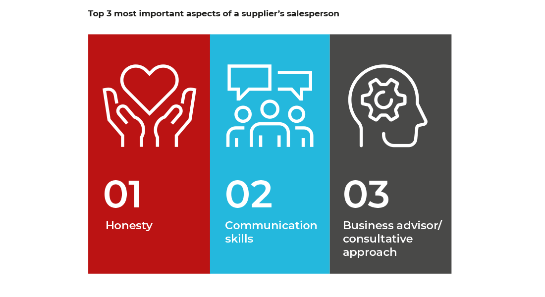 Købere er på udkig efter strategiske tænkere, der ikke kun kan demonstrere en god forretningssans, men som også kan sætte sig ind i deres daglige udfordringer og arbejde sammen med dem for at opnå et positivt resultat. Godt samarbejde rangerer på fjerdepladsen som en ønsket egenskab til at overvinde udfordringer og identificere muligheder for gensidig vækst og værdiskabelse. Virksomhederne er på udkig efter partnere, der har en rådgivende tilgang til at finde løsninger, og som har en troværdig forståelse af deres egne produkter og tjenester.