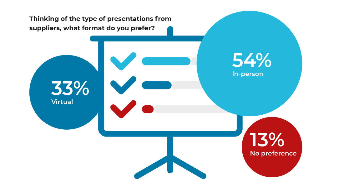 Efter den nylige pandemi antog mange, at virtuelt salg ville blive normen, men vores undersøgelser viser, at indkøbere fortsat har mere engagement med interaktioner face to face. Da vi spurgte om præsentationspræferencer, ønskede 54% personlig kontakt mod 33%, der valgte virtuel kontakt. Selvom leverandørerne ikke bør opgive deres online kommunikationsværktøjer, er de nødt til at bevare og forbedre det personlige touch, uanset om de sælger personligt eller via en skærm.