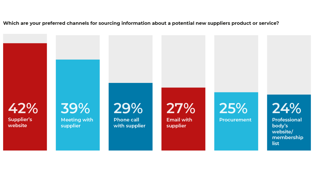 Når køberne kommunikerer med sælgere, har de stadig en tendens til at foretrække traditionel kommunikation som e-mail (70%), personligt fremmøde og telefonopkald som de tre mest foretrukne. Dette går imod den udbredte holdning, at kold kanvas er dødt. Vores undersøgelser viser, at indkøbere faktisk stadig er åbne over for telefoniske henvendelser fra nye potentielle leverandører, især hvis de bakkes op af en henvisning (38%). Dog kræver indkøbere mere personalisering og relevans, når de modtager uopfordrede interaktioner.