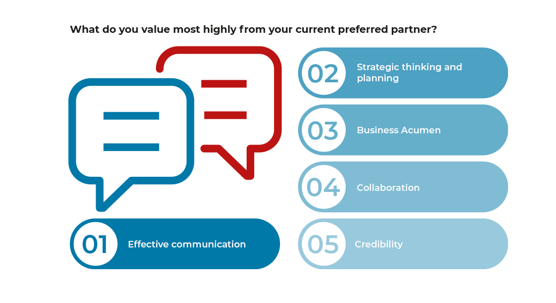 Ud over kommunikation prioriterer organisationer også strategisk tænkning og planlægningsevne, når de overvejer, hvem de skal arbejde sammen med. Beslutningstagere er nødt til at føle sig sikre på, at deres leverandørers mål er effektivt afstemt med deres egne organisationers bredere strategiske mål.