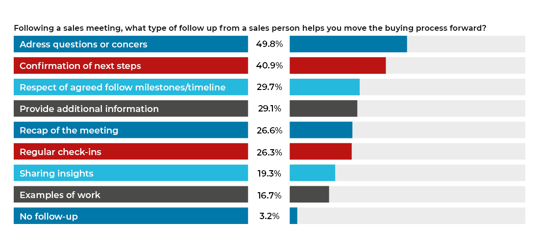 71% af køberne vurderer, at sælgerne er gode til at kommunikere ansigt til ansigt og via e-mail, sammenlignet med via virtuelle platforme (53%). Overraskende nok rangerer sociale medieplatforme som LinkedIn meget lavt som en form for salgsengagement (13%). Selvom disse platforme har en vigtig rolle i salgscyklussen, er de bestemt ikke så vigtige som andre kommunikationskanaler.
